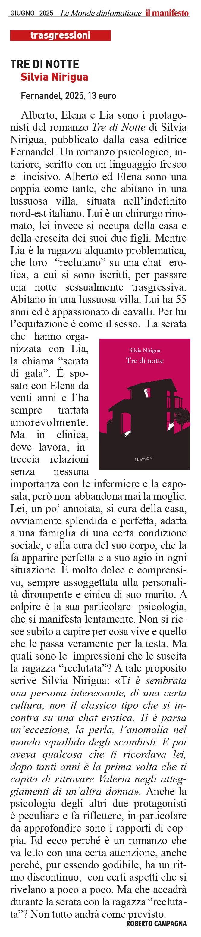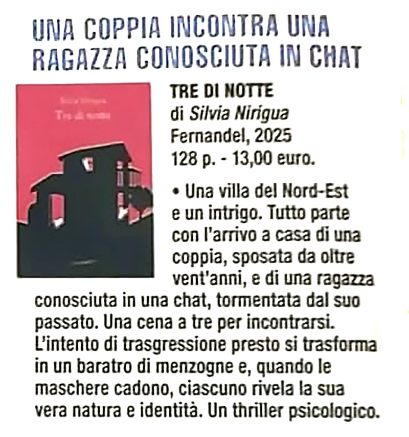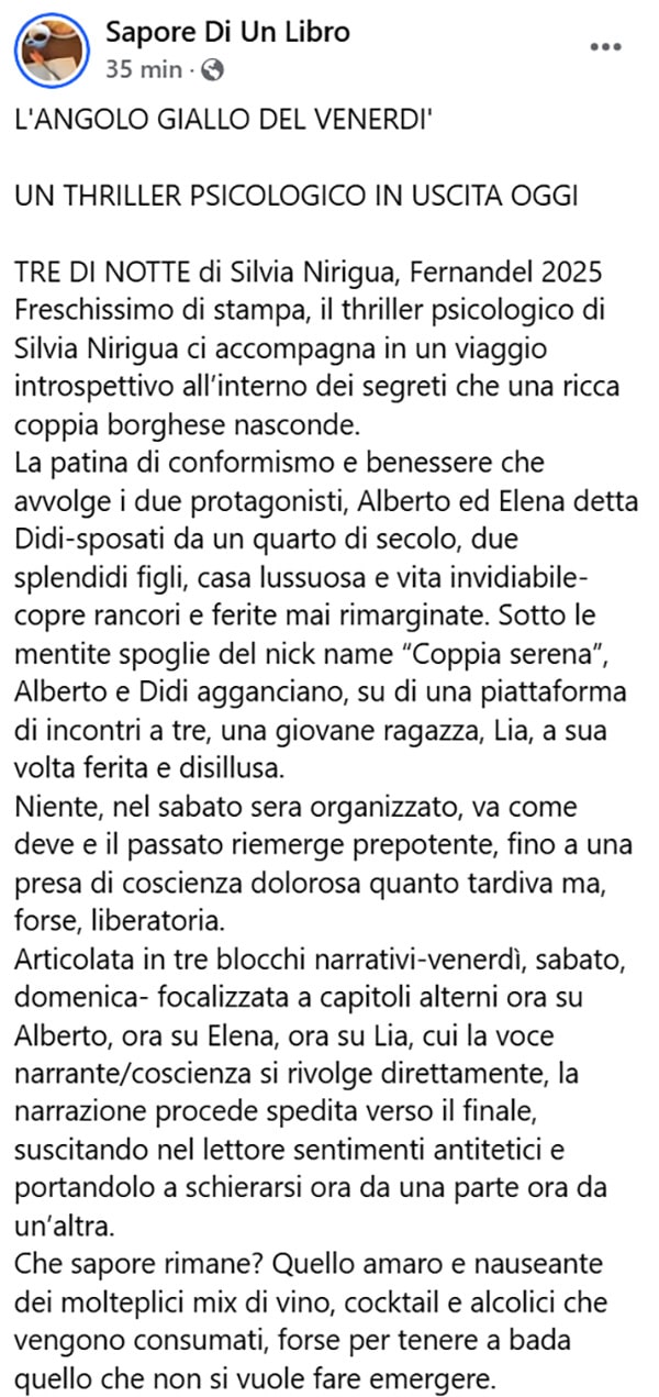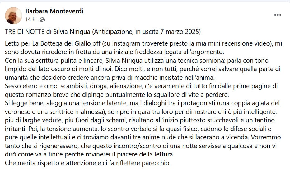 Con una scrittura affilata e uno stile chirurgico che non concede tregua al lettore, Tre di notte è un romanzo che avanza inesorabile verso un finale inaspettato.