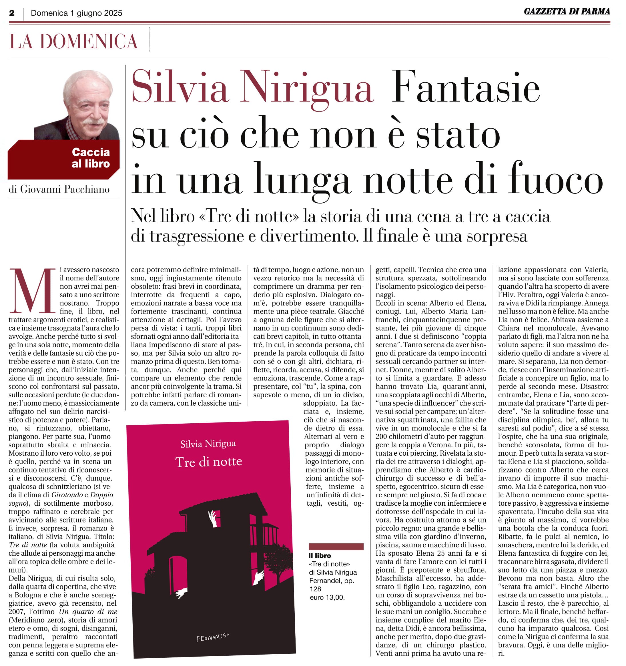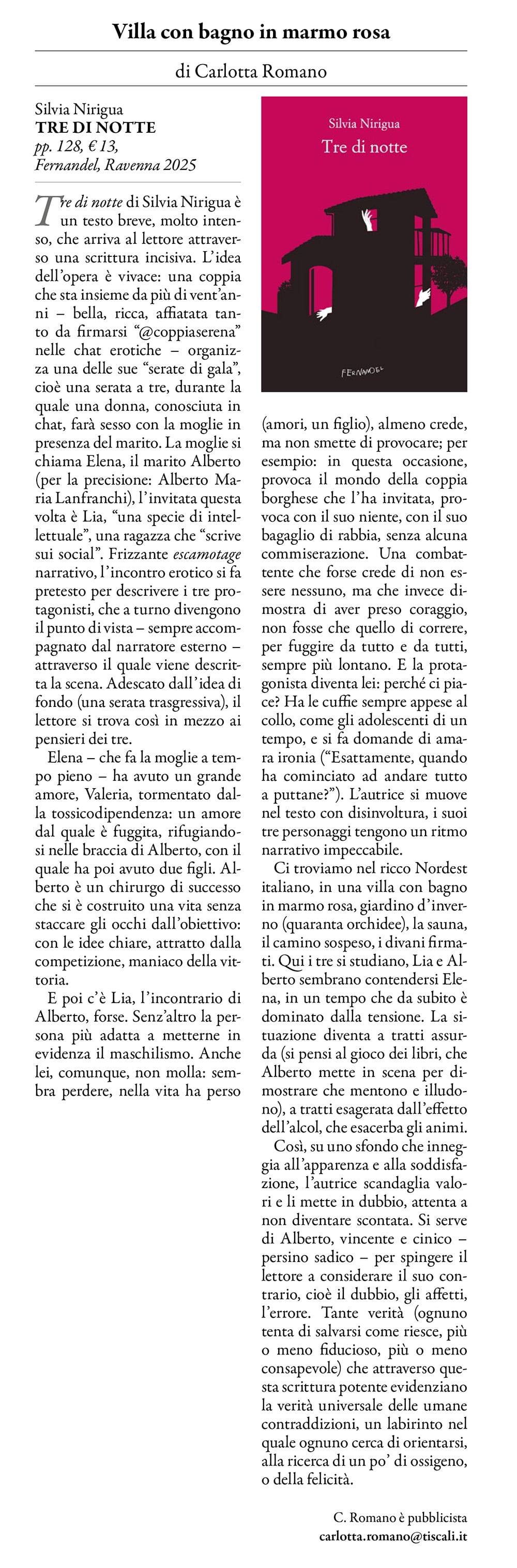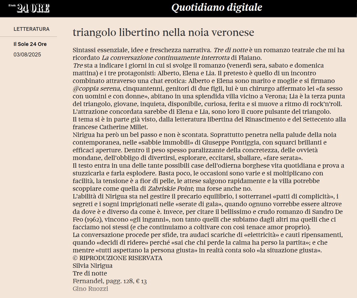 Con una scrittura affilata e uno stile chirurgico che non concede tregua al lettore, Tre di notte è un romanzo che avanza inesorabile verso un finale inaspettato.