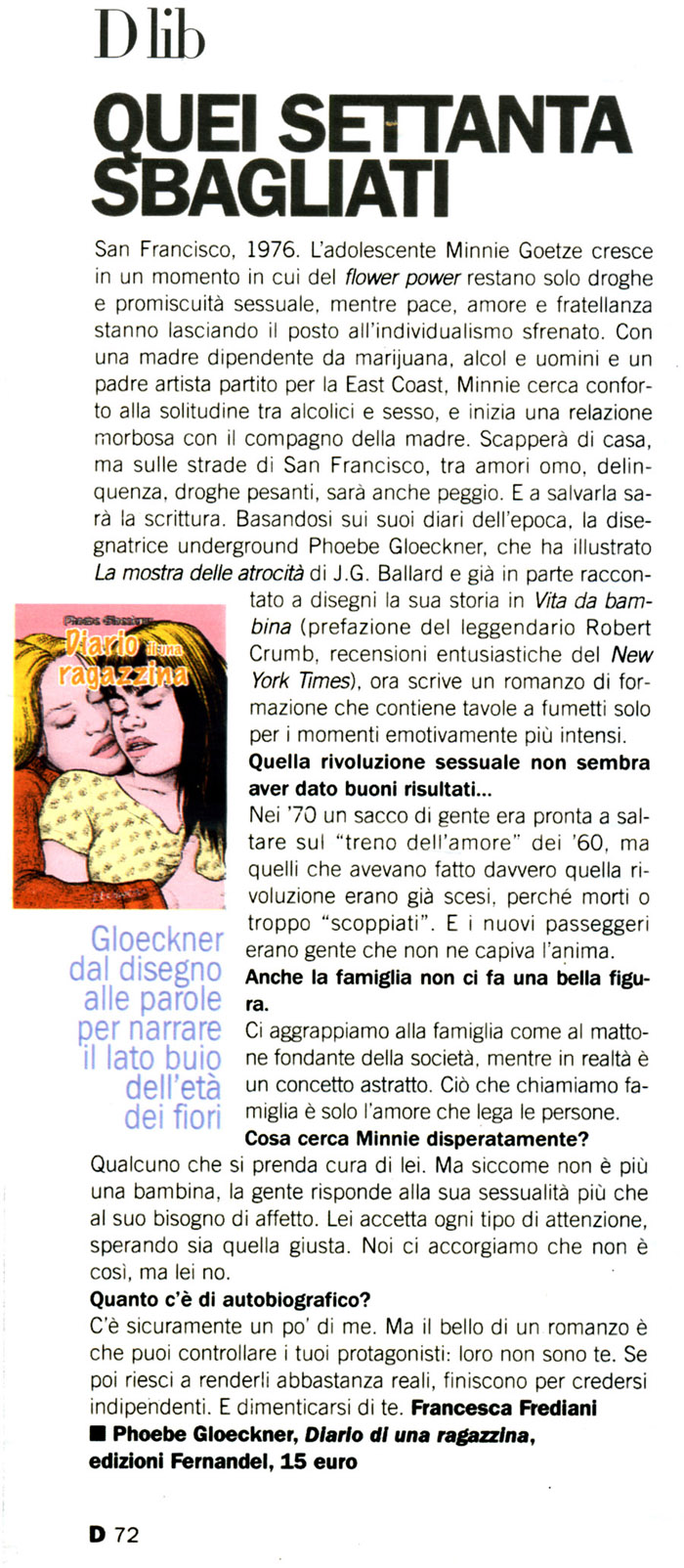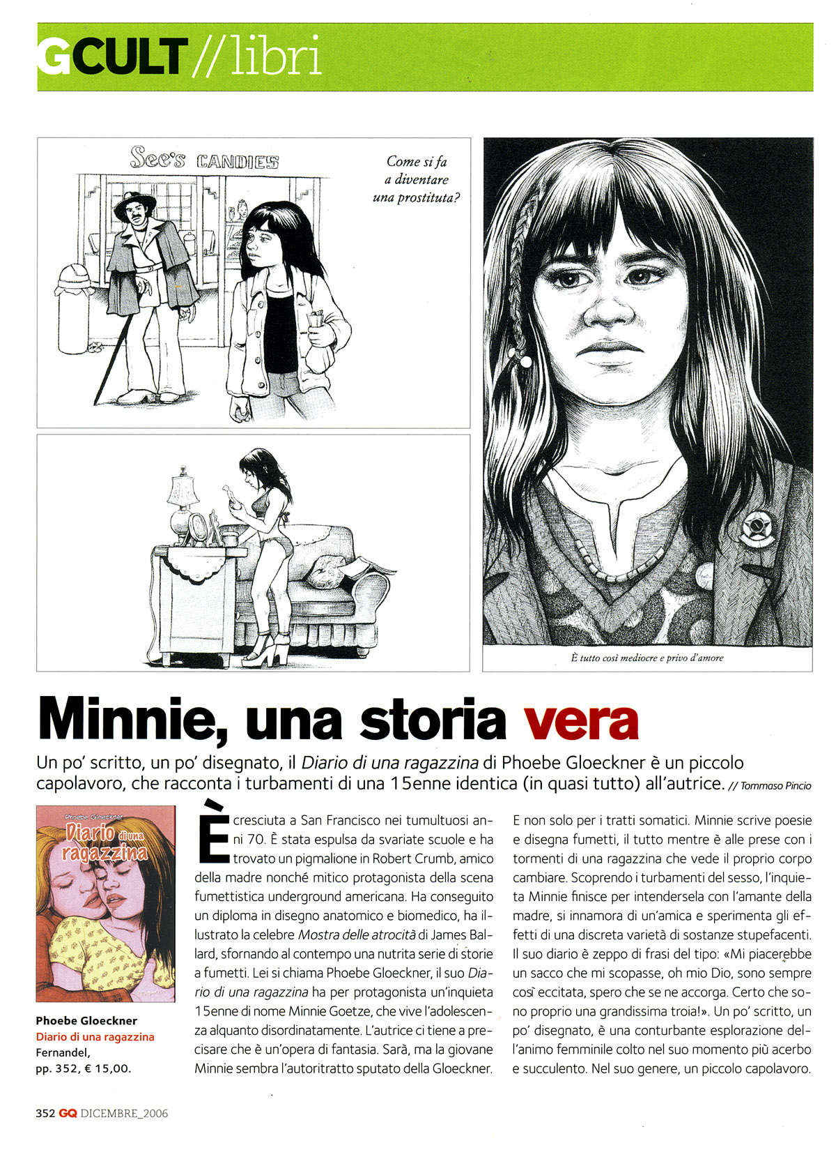 Phoebe Gloeckner, nata a Filadelfia e cresciuta a San Francisco, dopo aver frequentato la Scuola quacchera ottiene un Master of the Art in disegno anatomico e biomedico nel 1988 e illustra il romanzo di J.G. Ballard La mostra delle atrocità (2001). Gloeckner si rivela come fumettista underground grazie anche alla consacrazione ottenuta dopo una ricca corrispondenza con Aline Kominski, moglie del cartoonist Robert Crumb che incuriosito dallo stile di Phoebe, scrive un'appassionata introduzione al suo disturbante Vita da bambina (2002), raccolta di crude storie di sesso, droga e disperazione e curiosi ritratti, dove l'autrice mette a frutto il proprio talento d'illustratrice medica, come nella raggelante fellatio interpretata in chiave "anatomica". Diario di una ragazzina (Fernandel, pp. 352, euro 15) integra e completa Vita da bambina, raccontando l'infanzia e l'adolescenza di Minnie Goetze (specchio autobiografico dell'autrice) in un'ardita miscela di fumetti, illustrazioni e testi, intrisi di un tale "male d'esistere", a base di sesso, droga e solitudine, che le Melissa P. nostrane possono solo sognarsi.