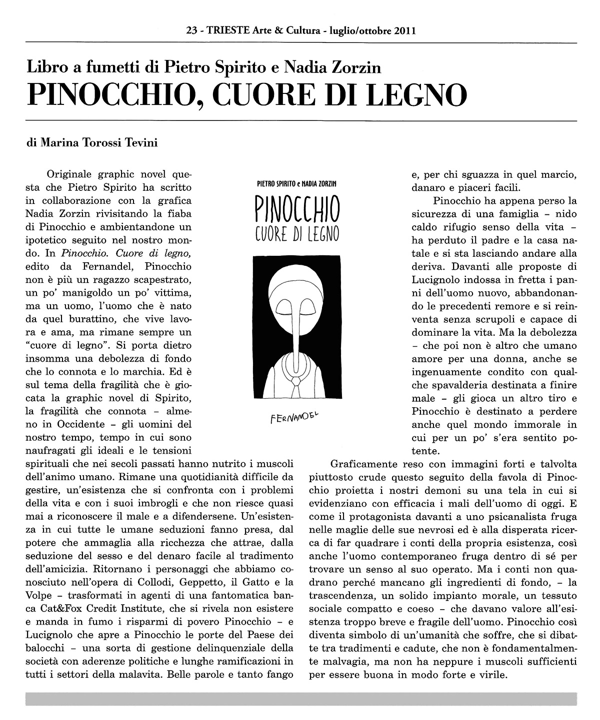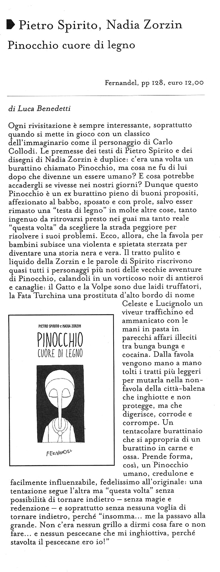Tutti conoscono la favola di Pinocchio, il burattino dissennato e bugiardo che si trasforma in un bambino saggio e buono. Ma che succede dopo? Come va a finire la storia quando il Pinocchio uguale a tutti noi cresce, studia, diventa uomo, trova un lavoro, mette su famiglia e affronta le responsabilità di ogni giorno? Chi nasce con un cuore di legno può davvero cambiare il suo destino? Nella tradizione delle riletture dell’opera di Collodi, ecco la parabola di una caduta, una favola noir dei nostri giorni che parla del predominio dei poteri criminali, dell’avidità, dello smarrimento e della fragilità dell’uomo contemporaneo. Geppetto, il Gatto e la Volpe, Lucignolo, il Grillo parlante tornano per raccontare una morale contraria che segna i limiti del vivere in questo mondo.